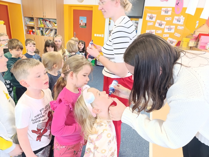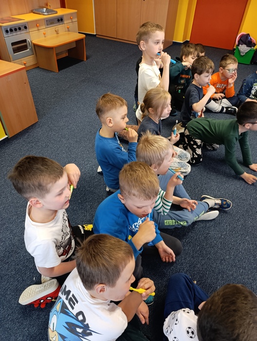 Následně byla dětem názorně ukázána správná technika čištění zubů. Děti si přinesly vlastní zubní kartáčky a pod vedením si samy vyzkoušely, jak si zuby správně čistit.