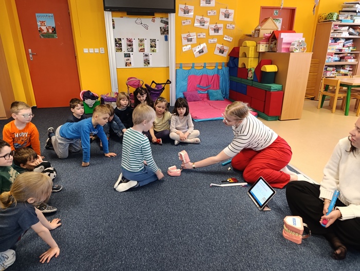 V rámci preventivního programu zaměřeného na zubní hygienu byly děti nejprve seznámeny se základními názvy zubů, jako jsou řezáky, špičáky a stoličky. Pomocí obrázků a jednoduchého vysvětlení se dozvěděly, k čemu jednotlivé zuby slouží a proč je důležité o ně pečovat.
